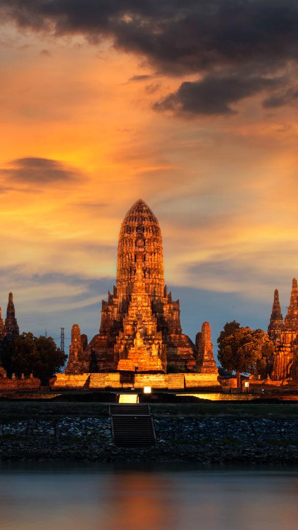 When the sunset casts its spell over Thailand, the Wat Chaiwatthanaram Buddhist temple lights up to welcome the night at the Ayutthaya Historical Park. Even though the temple is not part of the nearby Historic City of Ayutthaya (a UNESCO World Heritage Site), the ruin is just as divine, exhibiting meticulous details of rich history and architecture. King Prasat Thong—from the dynasty of the Siamese Ayutthaya Kingdom that ruled Southeast Asia between the 14th and 18th centuries—built the sanctuary to symbolise the centre of the universe and connote his aspiration to become the future Buddha. From the Buddhist temple, the Historic City of Ayutthaya can be reached by boat or road. Three rivers link the once-metropolitan city of the Siamese Kingdom to the sea. Now a historical ruin, Ayutthaya was an important point of commerce and diplomacy, with the advantages of the surrounding rivers serving as natural defence.