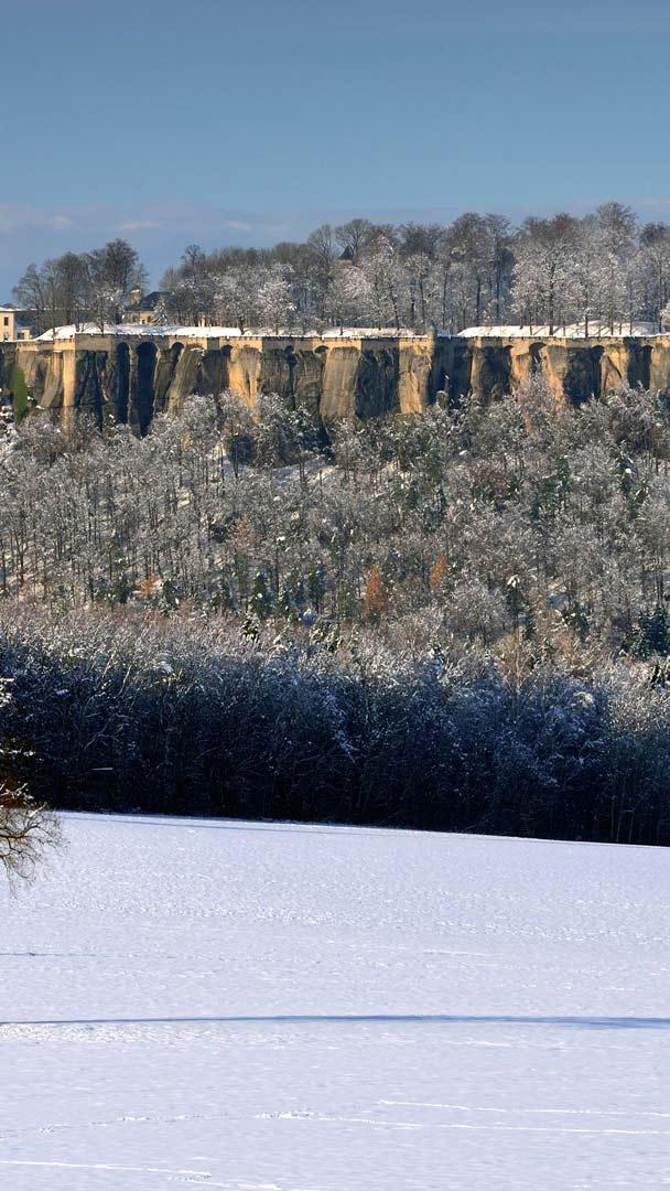 Königstein Fortress, one of the largest mountain fortresses in Europe, rises high in the Elbe Sandstone Mountains of Saxon Switzerland. The "Burgrave Gebhard vom Stein" is first mentioned in a document of King Wenceslas I of Bohemia in 1233, presumably referring to Königstein. At that time the area belonged to the Kingdom of Bohemia. In the 16th century, the castle underwent significant expansion to become a Saxon state fortress, with the start of construction of the imposing 152.5-metre-deep castle well between 1566 and 1569 being an important milestone. It is still one of the deepest historic wells in Germany.