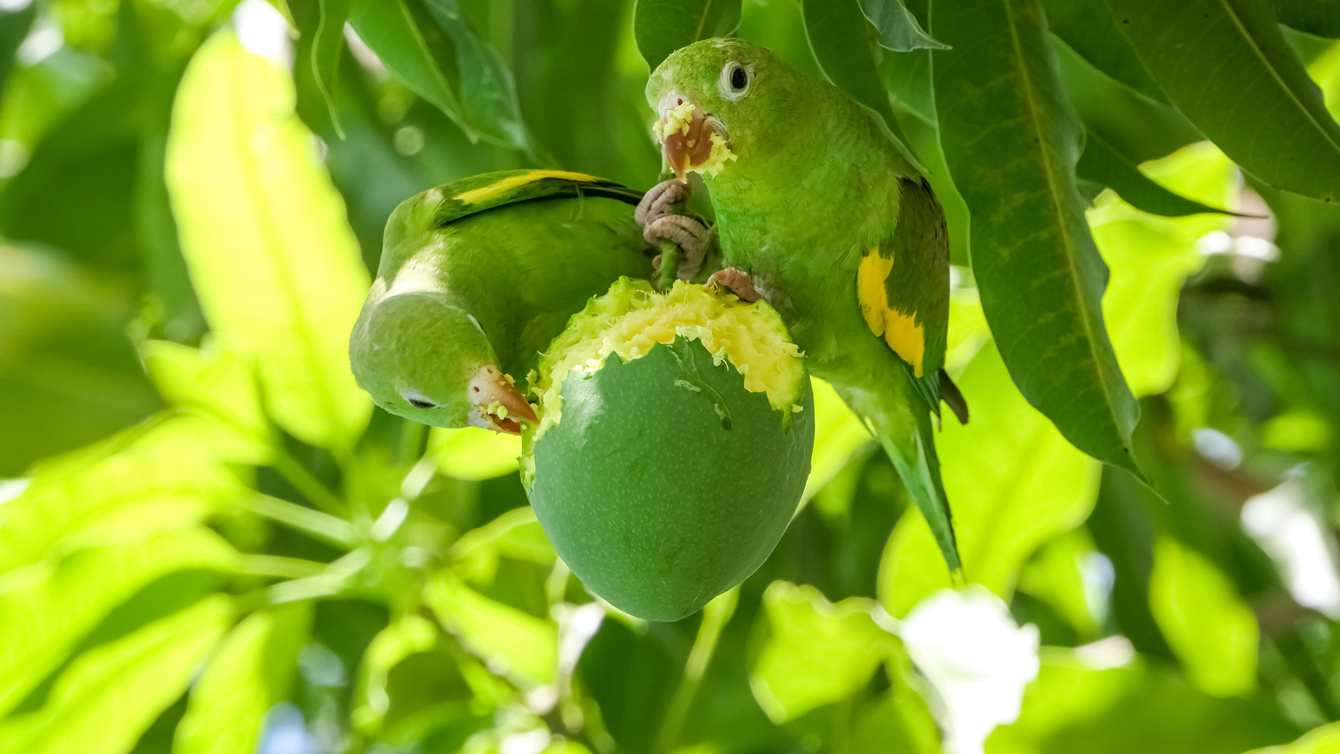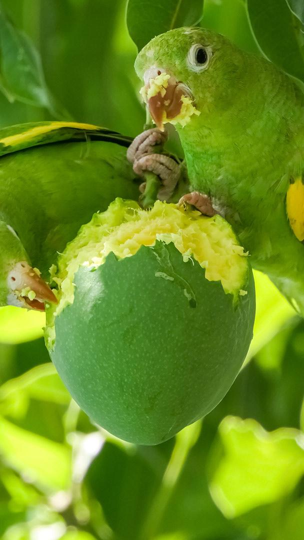 In the Pantanal, Brazil, the diversity of life is extraordinary. Among trees full of fruit, the yellow-chevroned parakeet stands out, as seen in today"s image. This bird feeds on seeds and fruits, such as mangoes. Its intense green, marked by yellow stripes on its wings, contrasts with the illuminated canopy, creating a spectacle that reveals the harmony of this unique ecosystem.