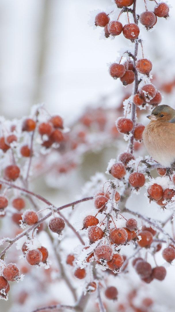 Chama de vida em meio a neve Tentilhão macho pousado em uma macieira (© Mark Hamblin/2020VISION/Minden Pictures)