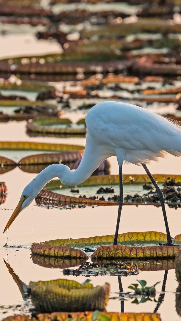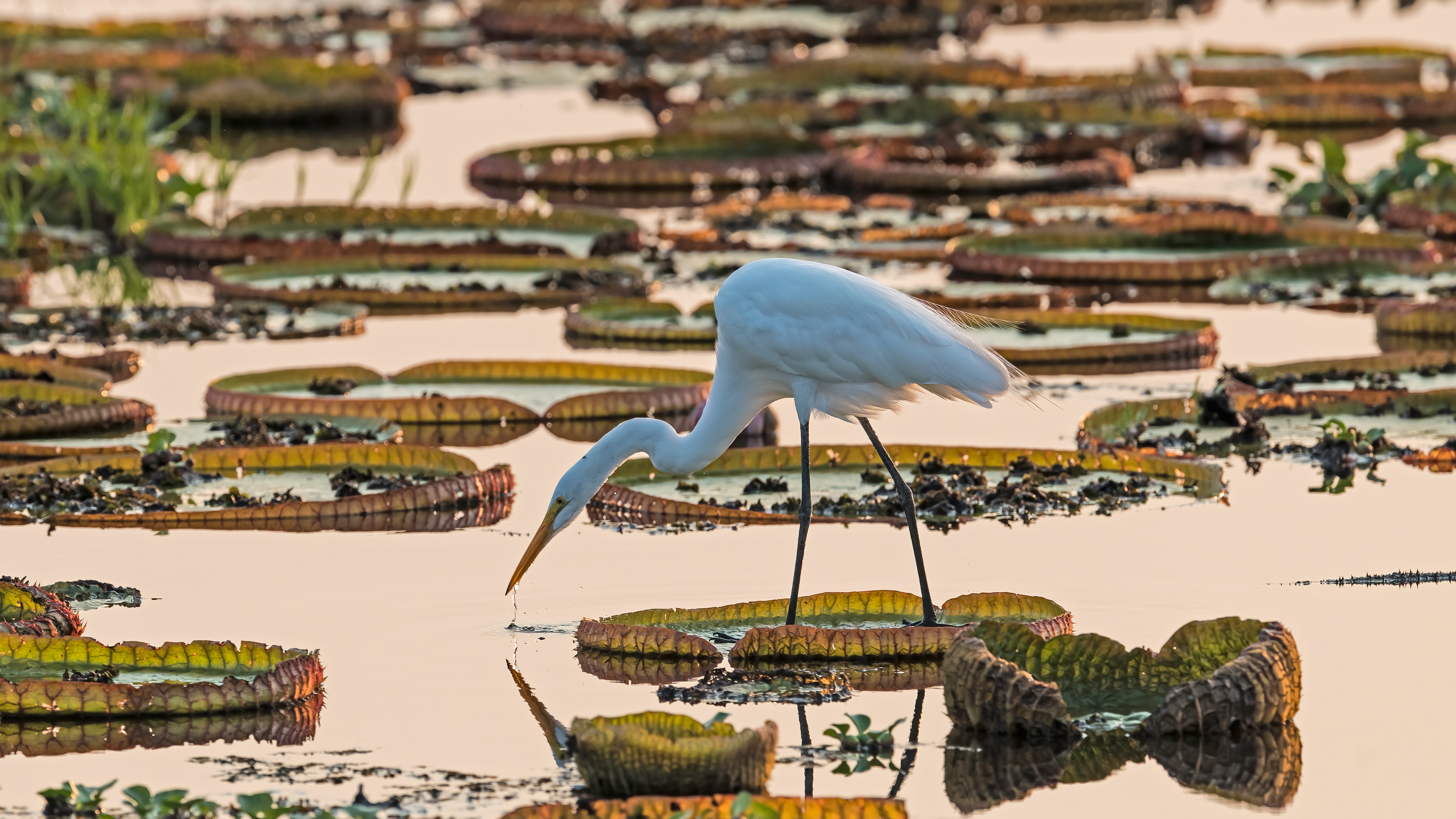 Símbolo de pureza e graça Garça-branca-grande (Ardea alba) em pé em uma lagoa de vitórias-régias, Pantanal (© Geraldi Corsi/Getty Images)