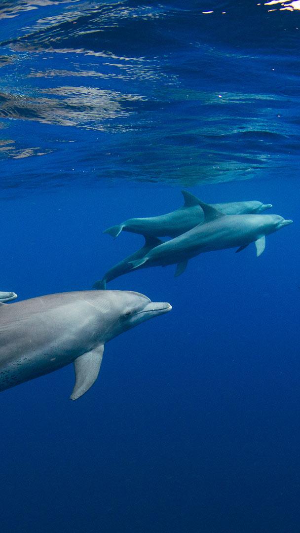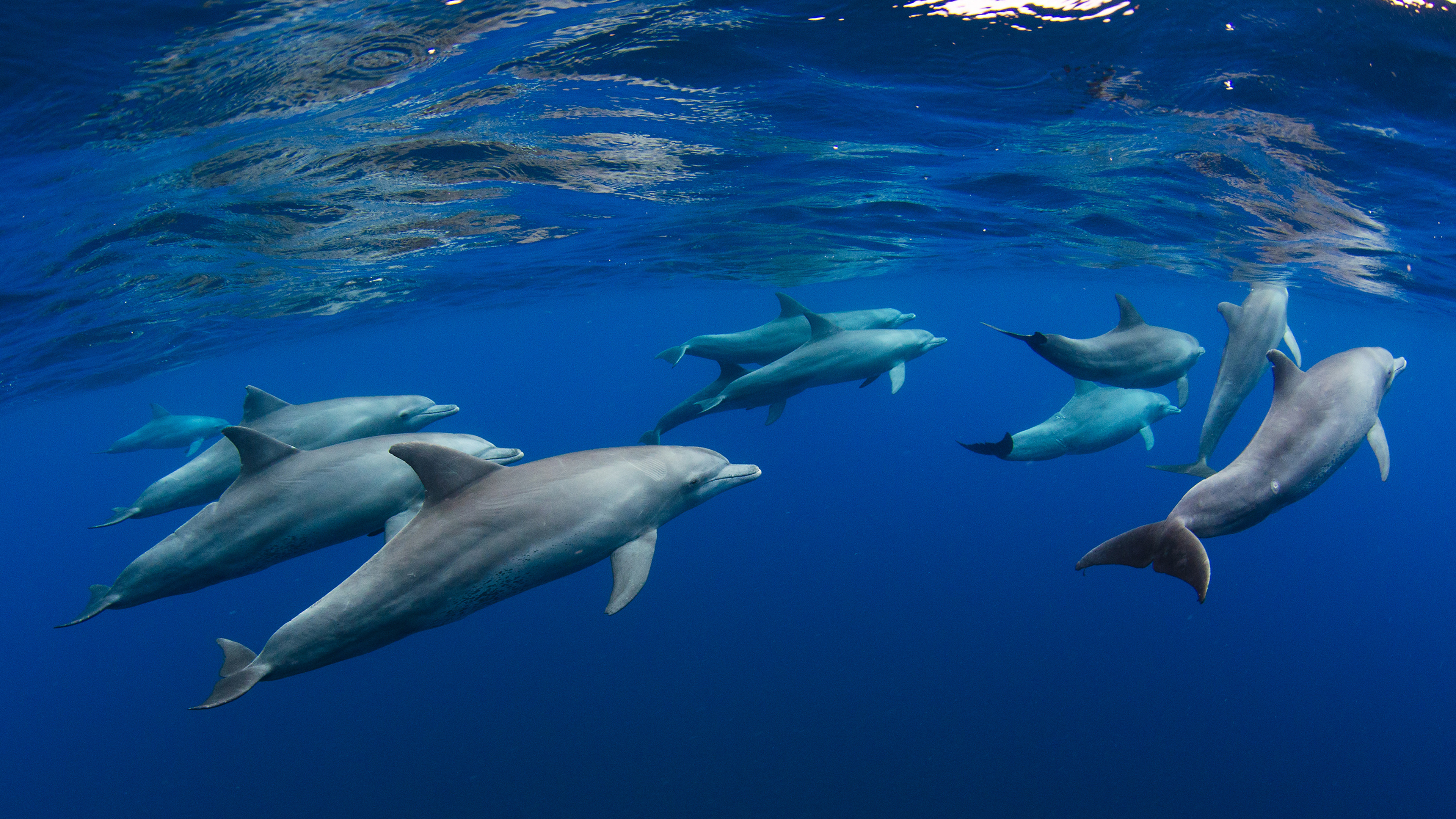 Golfinhos à vista! Grupo de golfinhos perto da Ilha da Reunião, Oceano Índico, Departamento Ultramarino Francês (© Joost van Uffelen/Shutterstock)