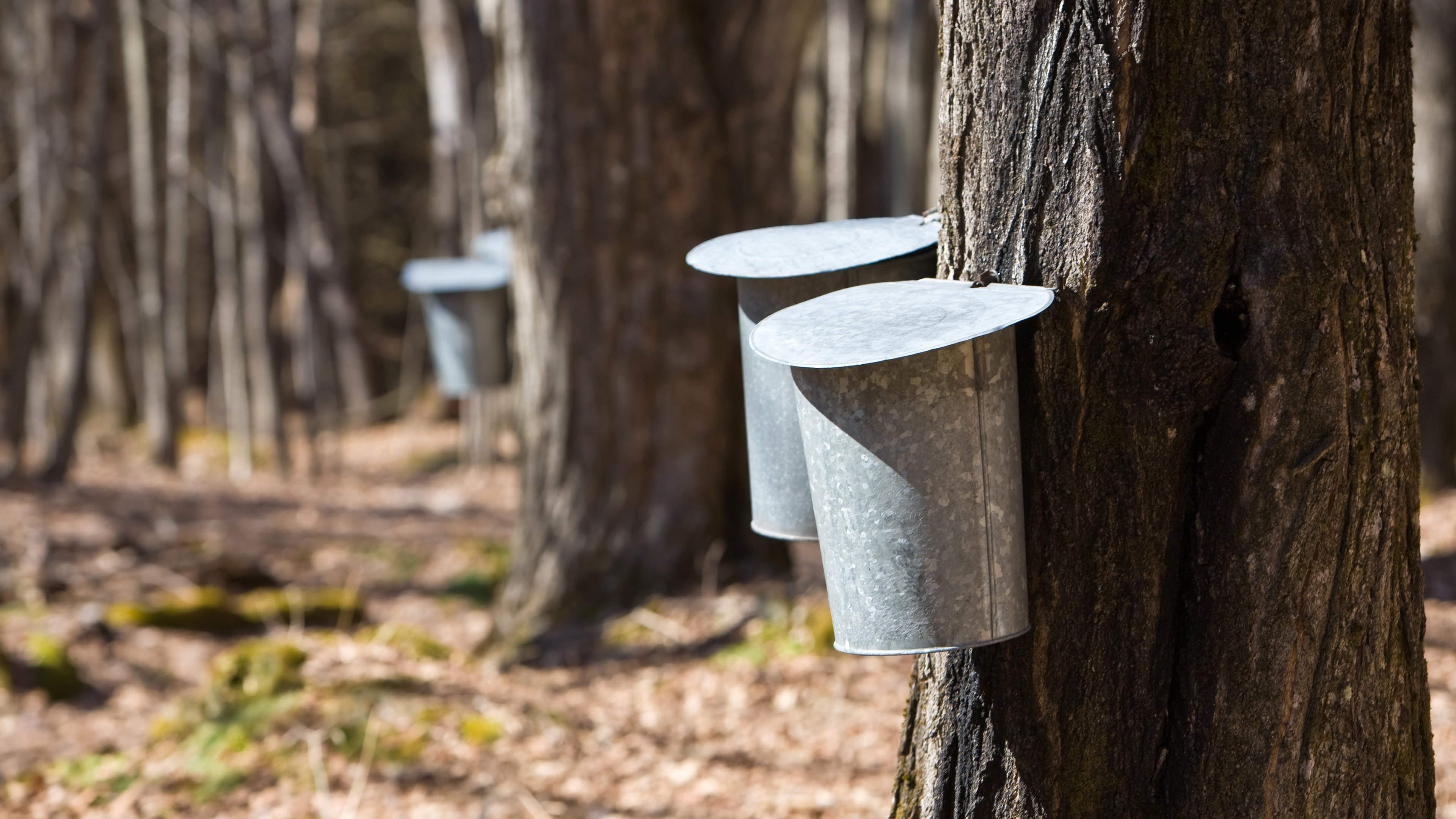 Buckets on maple trees collecting sap for maple syrup © capecodphoto/Getty Images