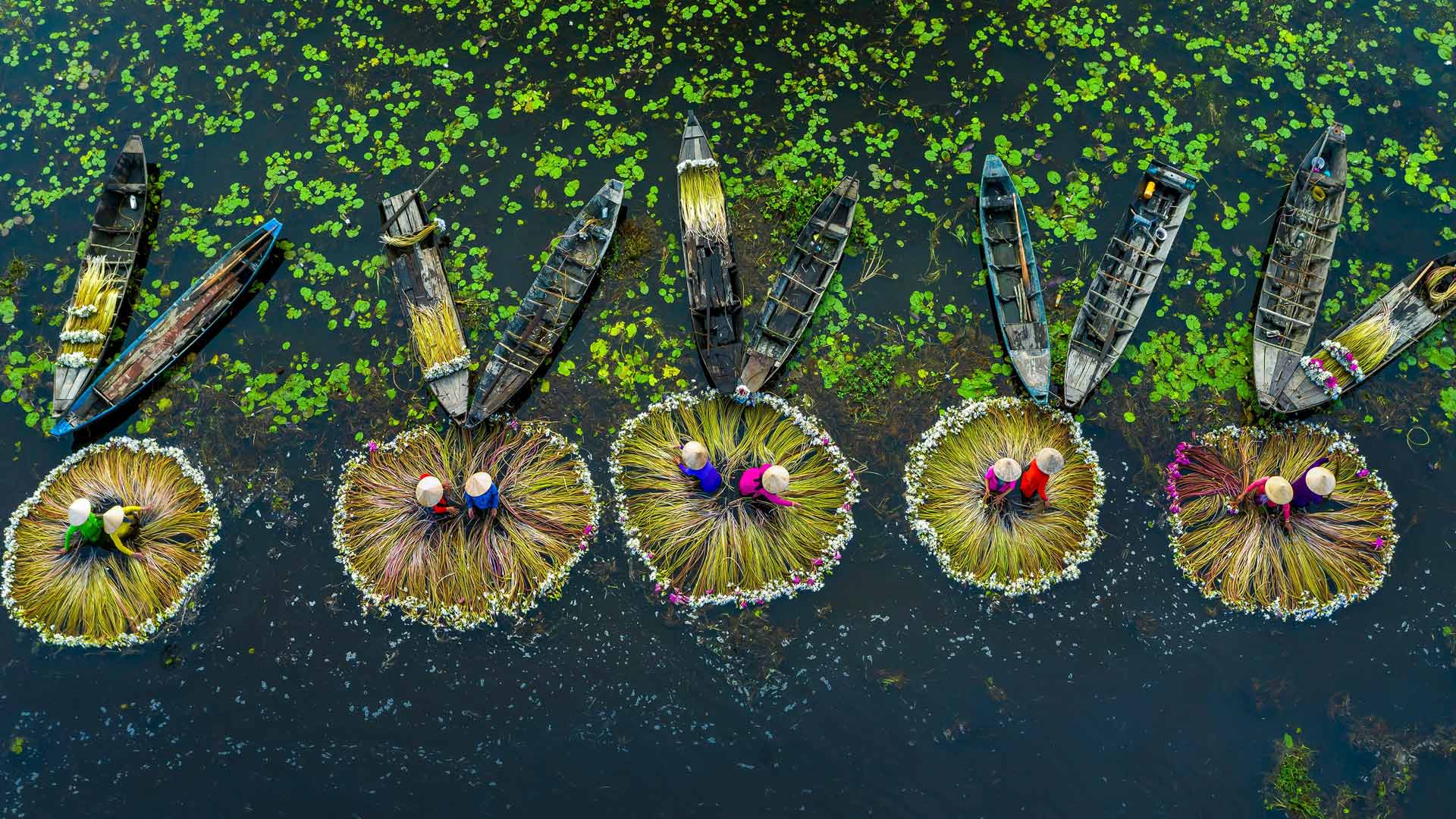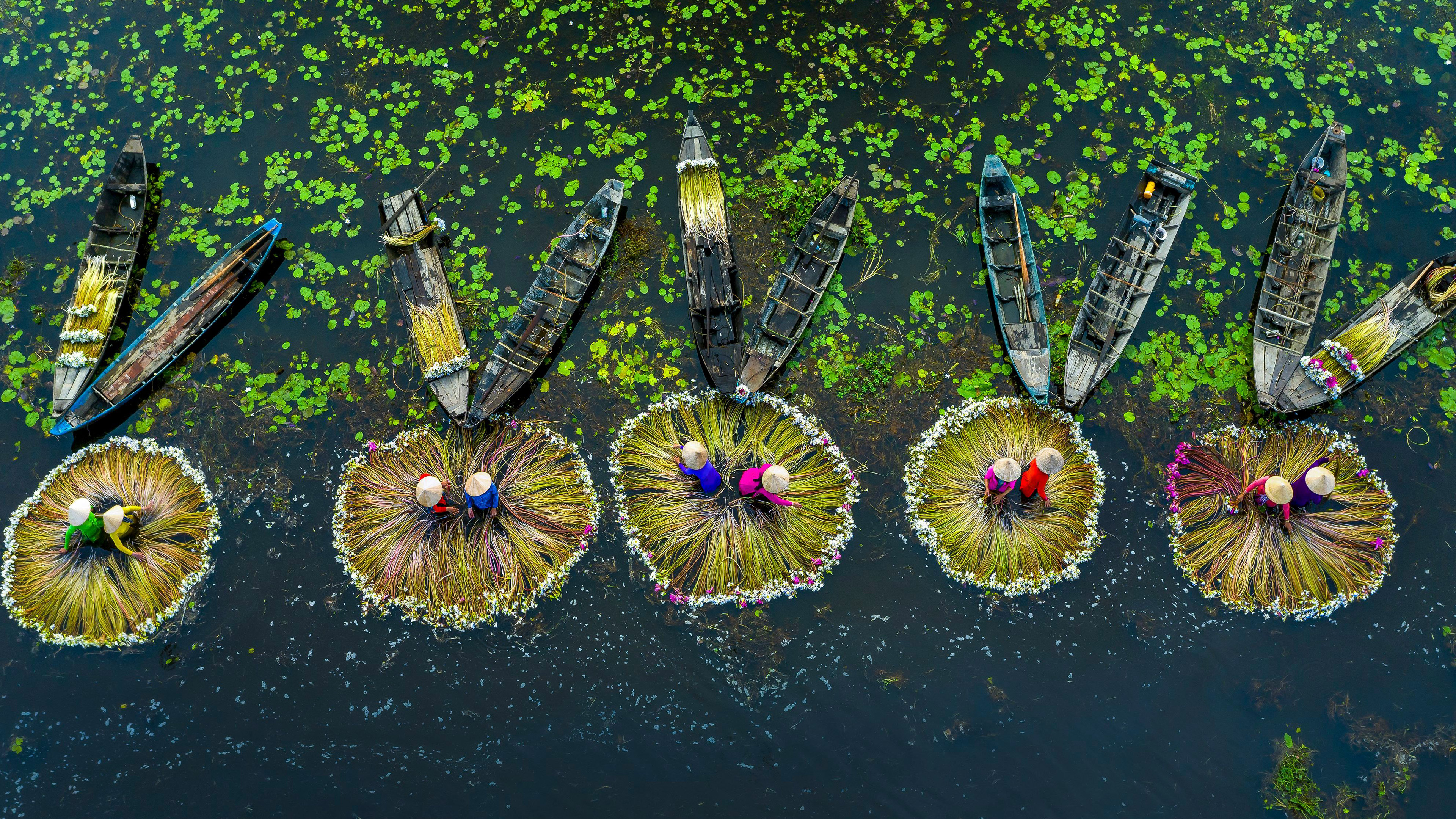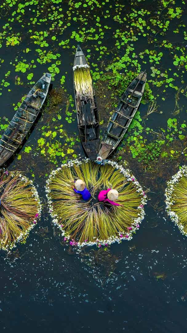 In the heart of Vietnam, where emerald rice fields stretch to the horizon and a mighty river flows with life-giving waters, flooding becomes an anticipated dance between nature and culture. The Mekong River experiences flooding every year, which turns this river into a photographer"s paradise. Adorned with elegant lilies that are nourished by the floods, farmers in the Long An province, in southeastern Vietnam, dedicate their days to harvesting the bloom of the plants. The annual floods bring in nutrients from upstream, enriching the fields and helping these flowers grow. These lilies also provide a food supply and contribute to the community"s economy since the stems are edible and the plant can be brewed into tea. These long-stemmed flowers pay tribute to nature"s ability to generate moments of amazing beauty that inspire and uplift the human soul.