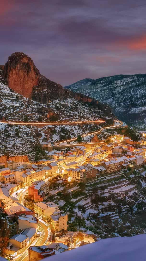 Snow might not be the first thing that pops into your mind when thinking about Spain, but thanks to its diverse landscapes from high peaks to warm beaches, Spain has it all. Featured in today"s image, the tiny village of Aýna—with a population of less than 1,000—lies in the steep valley carved by the river Mundo in the Sierra del Segura mountain range. Because of its snow-capped mountains during the winter months, the town is frequently called Manchegan Switzerland—with "Manchegan" referring to the autonomous community of Castile-La Mancha that Aýna is a part of. About 240 kilometres south of the capital, Madrid, Aýna offers a unique glimpse into Spanish village life.