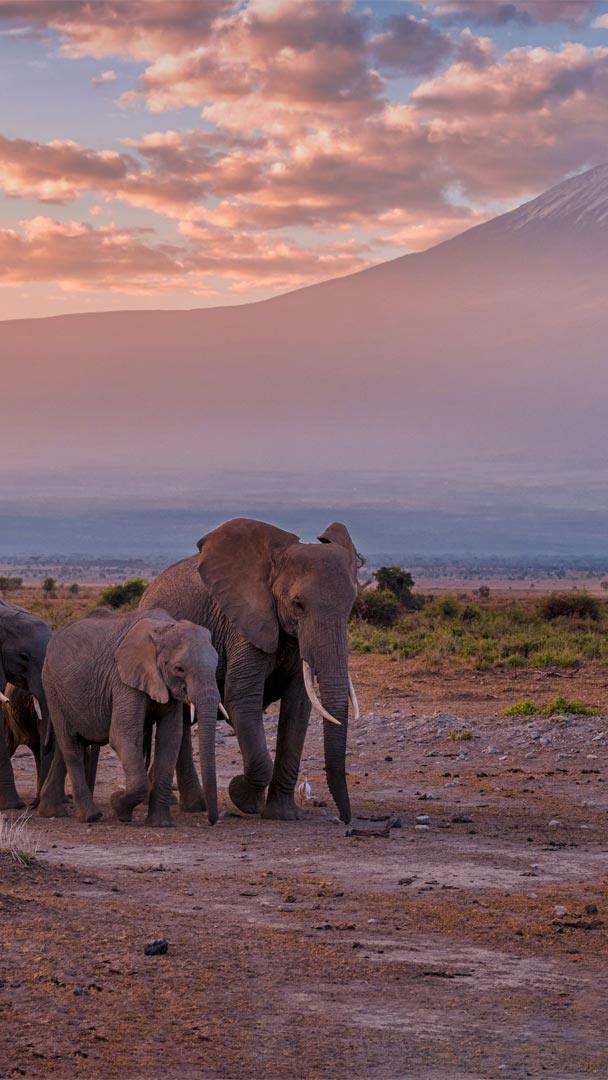 象群在路上 乞力马扎罗山附近的大象,安波塞利国家公园,肯尼亚 (© Diana Robinson Photography/Getty Images)