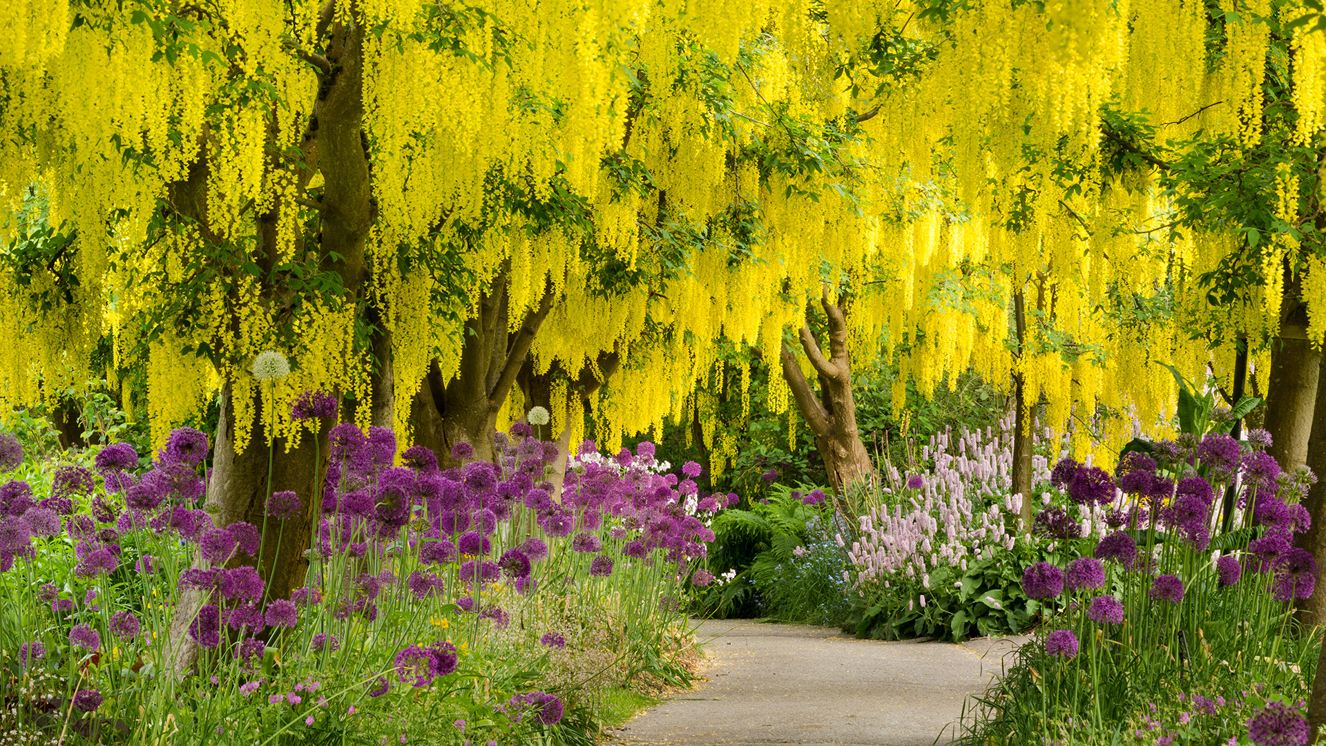 一张来自春天的快照 盛开的金链花树和紫色葱属植物,加拿大温哥华范度森植物园 (© Greg Vaughn/Alamy)