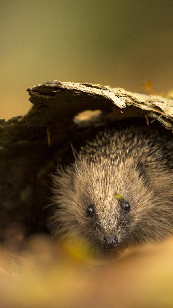 该位置已被占领 躲在树皮中欧洲刺猬,苏塞克斯,英国 (© Jules Cox/Minden Pictures)
