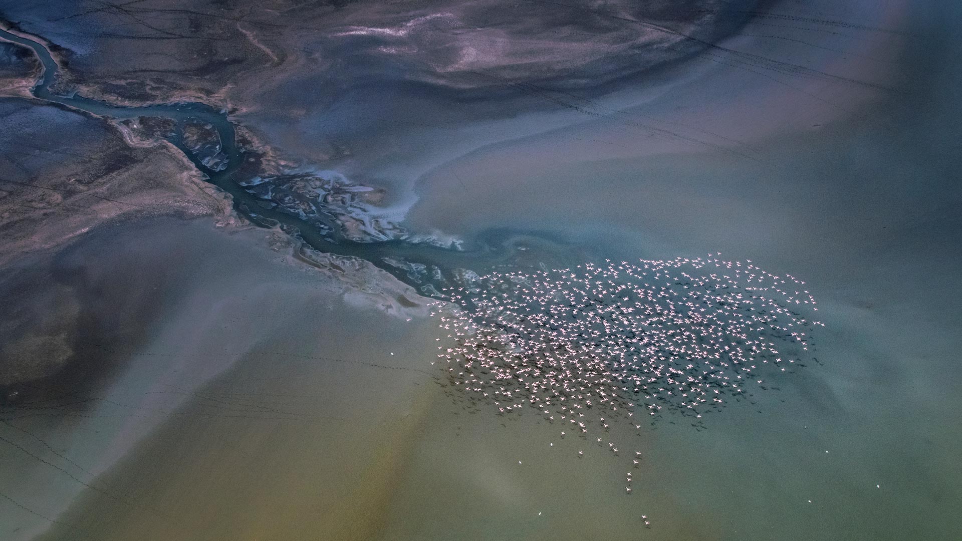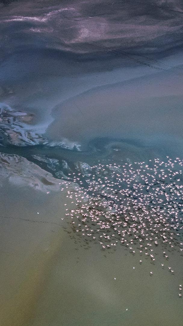 鸟瞰 小红鹳飞越马加迪湖,肯尼亚 (© Vicki Jauron, Babylon and Beyond Photography/Getty Images)