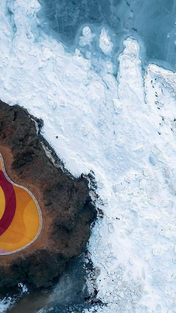 一路通往童话之路 鸟瞰冰封的大海和悬崖上的灯塔,大连泊霞湾公园,辽宁省,中国 (© zhengshun tang/Getty Images)