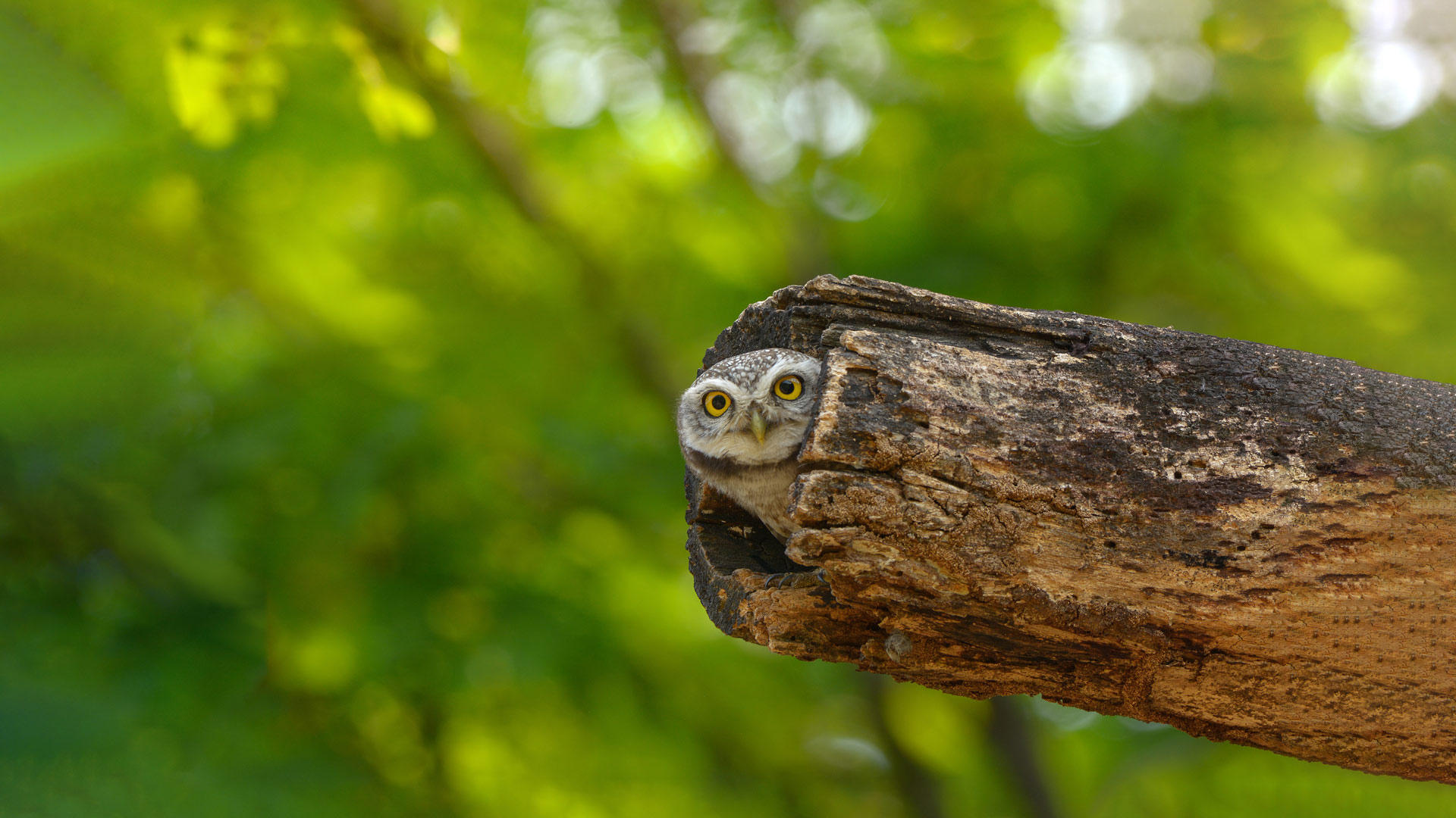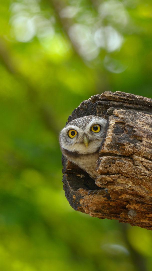 Fühlen Sie sich beobachtet? Der Fleckenkauz ist durch seine leuchtend gelben Augen auf dem graubraunen Gesicht unverwechselbar, wodurch er tagsüber öfters von kleineren Vögeln entdeckt und angegriffen wird. Sobald sie gesichtet werden, starren diese hauptsächlich nachtaktiven Eulen die Eindringlinge an, wackeln mit dem Kopf und stoßen laute Schreie aus, die manchmal auch als Lachen oder Kichern beschrieben werden. Gefleckte Eulen sind etwa 20 Zentimeter groß und kommen vom Iran bis nach Vietnam vor. Dieses Exemplar wurde in Bangkok, Thailand, fotografiert. Sie ernähren sich hauptsächlich von Insekten und kleinen Säugetieren wie Fledermäusen und Mäusen, die sie oft auf Vorrat halten, um sie später zu fressen, wenn die Nahrung knapp wird. Fleckenkäuze sind eine bemerkenswert widerstandsfähige Art, die in Umgebungen wie Halbwüsten, felsigen Gebieten, Wäldern, Ackerland und städtischen Gebieten vorkommt.