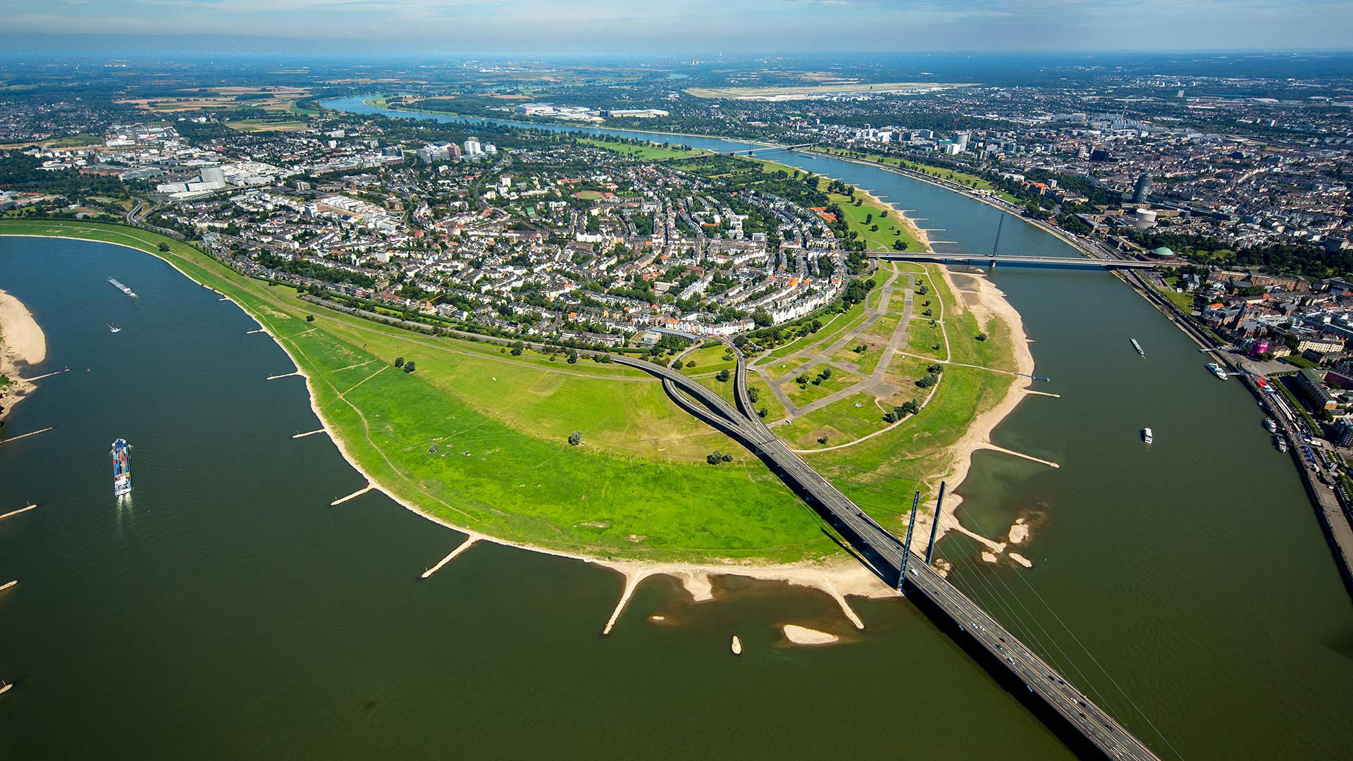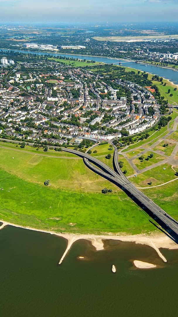 Stadtteil am Rheinknie Luftbild des Düsseldorfer Stadtteils Oberkassel mit Rheinkniebrücke und Oberkasseler Brücke, Nordrhein-Westfalen (© Hans Blossey/Alamy Stock Photo)