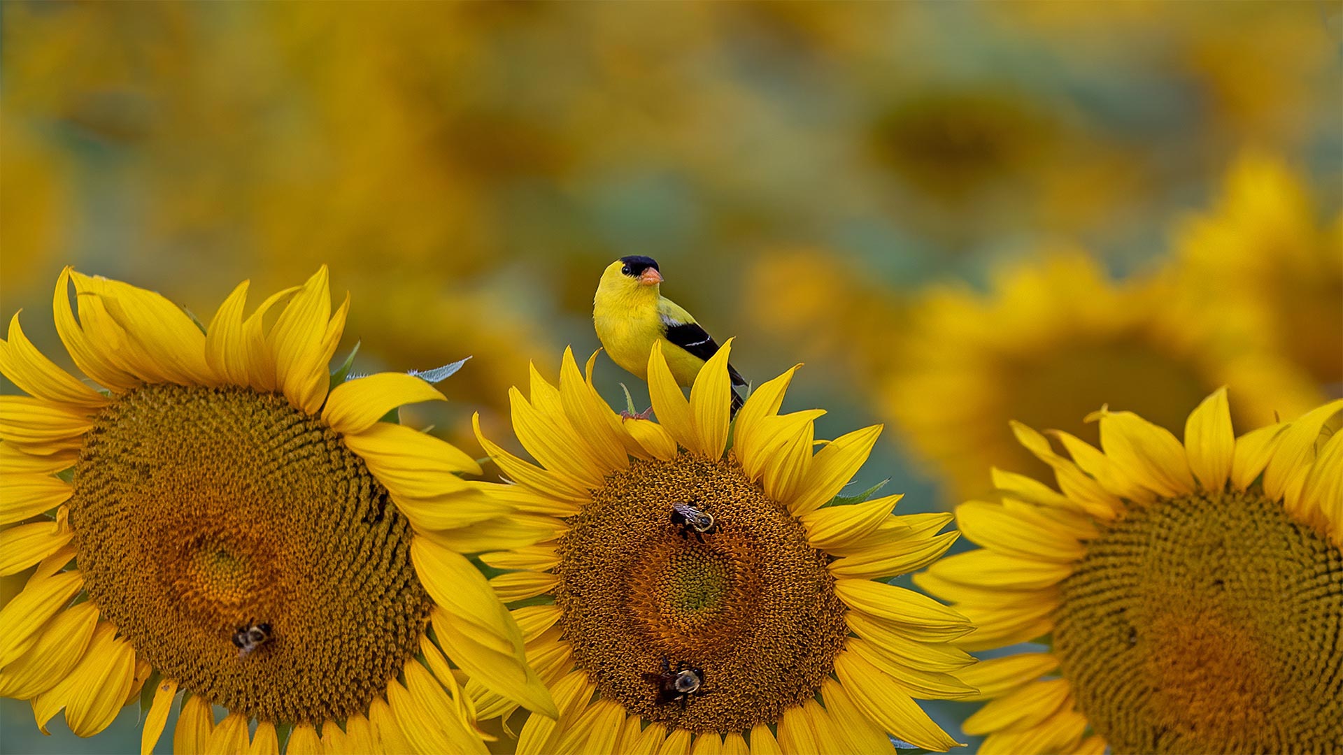 Ton sur ton Chardonneret jaune sur un tournesol à McConnells, Caroline du Sud, États-Unis (© Teresa Kopec/Getty Images)