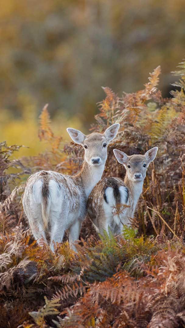 Le daim est connu pour son pelage étonnant qui change de couleur selon les saisons et présente généralement des taches blanches en été. En automne, pendant la période du rut, les mâles s"affrontent pour établir leur domination. Ces derniers sont reconnaissables à leurs bois palmés, dotés d"une surface large et aplatie.