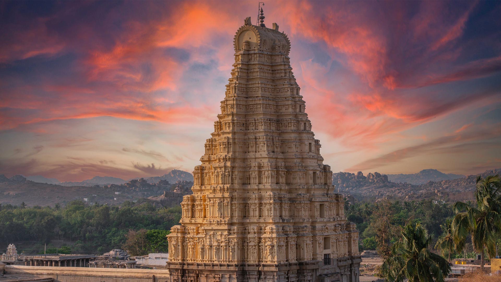 In the heart of Hampi, on the bank of the Tungabhadra River, the Virupaksha Temple is a stunning stone-crafted structure and the centerpiece of Vijayanagara, India. The temple is a complex combination of intricate Dravidian and Vijayanagara architectural styles, showcasing finely carved pillars, ornate mandapas and a towering gopuram. The superstructure was constructed from brick and mortar, with numerous captivating stucco figures adorning the exterior of the first tier. While there is intricate detail up close, a bit of distance showcases the full spectacle of the building. A highlight of the temple is the Hampi Bazaar—a street market that leads to the temple"s entrance. This lively place is lined with various stalls reminiscent of the historic trade and commerce that flourished in the area.