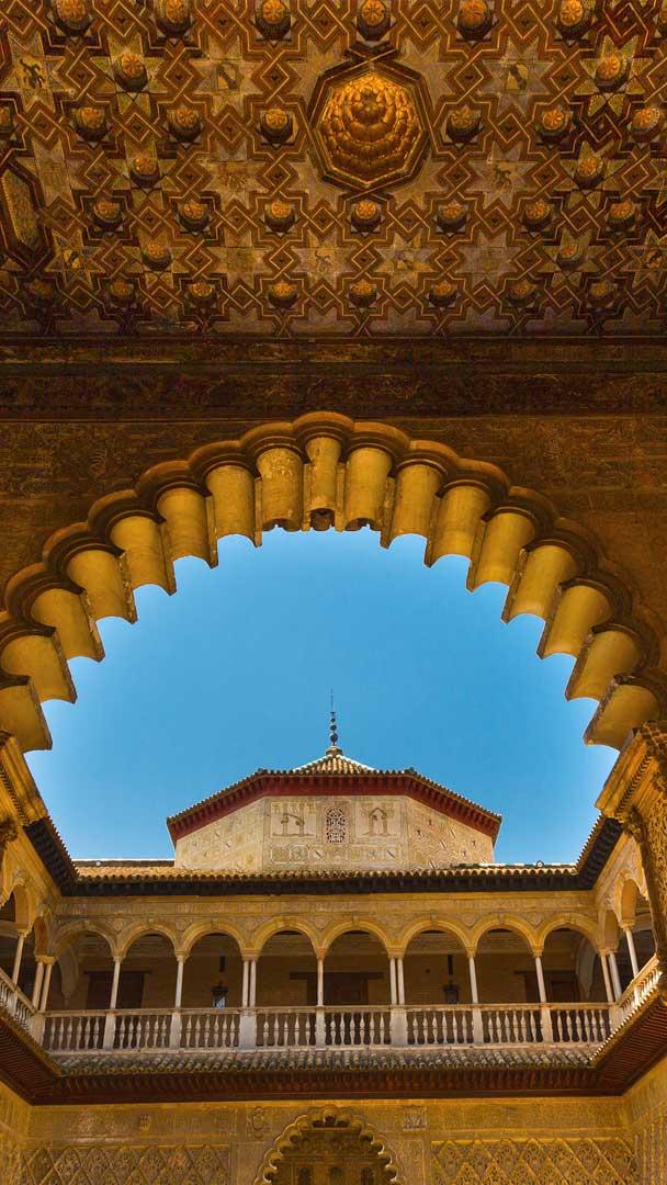 Today we"re stepping into the heart of the historic empire of Islamic Spain. The Royal Alcázar of Seville, in the southern region of Andalusia, stands on the site of a 10th century citadel, which was expanded over the following 200 years. When Christian forces captured the city in 1248, the Alcázar was almost totally rebuilt in the Mudejar style, which takes inspiration from the intricate patterns and decorative motifs found in Islamic architecture. Within the Alcázar, there are several courtyards lined with delicately carved columns. One of these is the Patio de las Doncellas, or Courtyard of the Maidens, pictured here today.