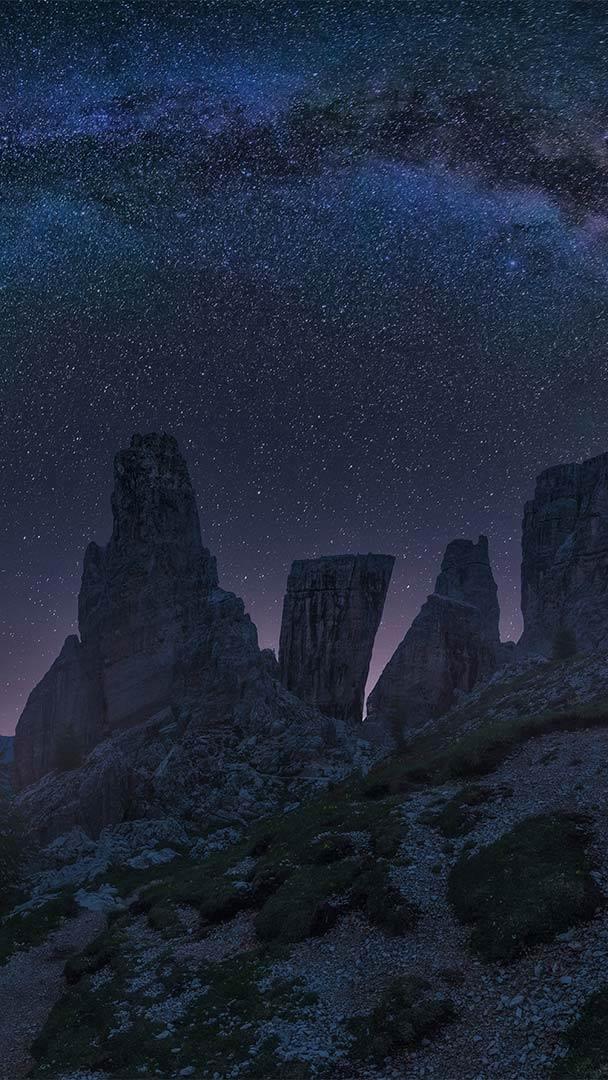 The rainbow bridge Dolomite Mountains at night with the Milky Way, Italy (© Carlos Fernandez/Getty Images)