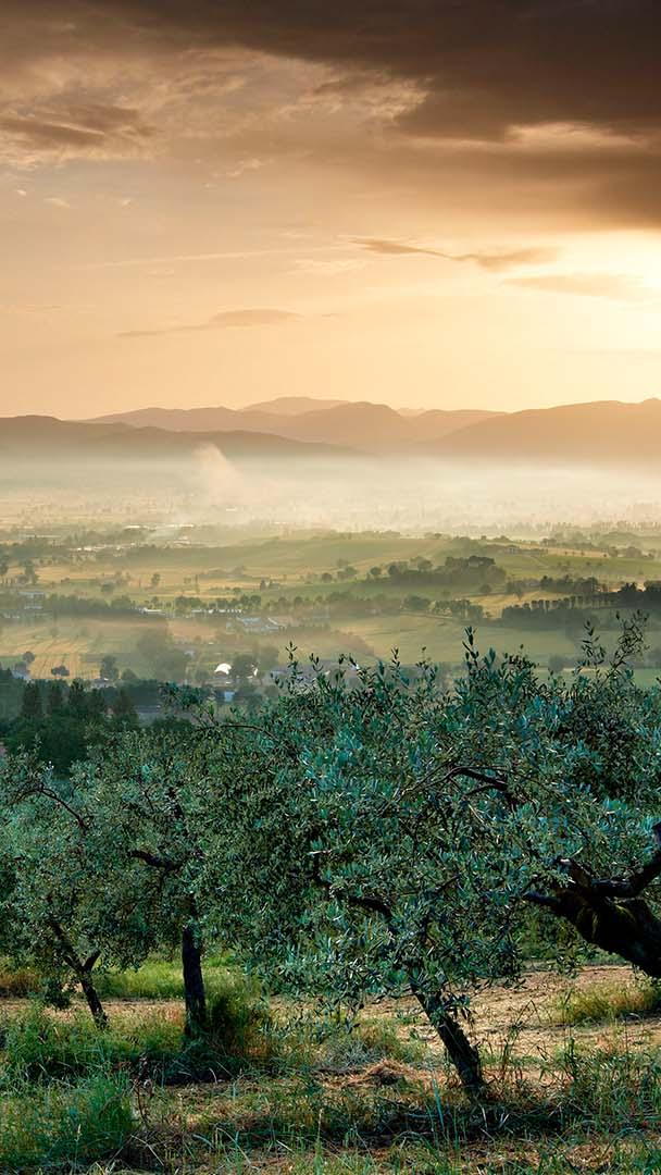 Ulivi nelle verdi colline umbre Uliveto con vista sulla valle, Bevagna (© David Noton Photography/Alamy Stock Photo)