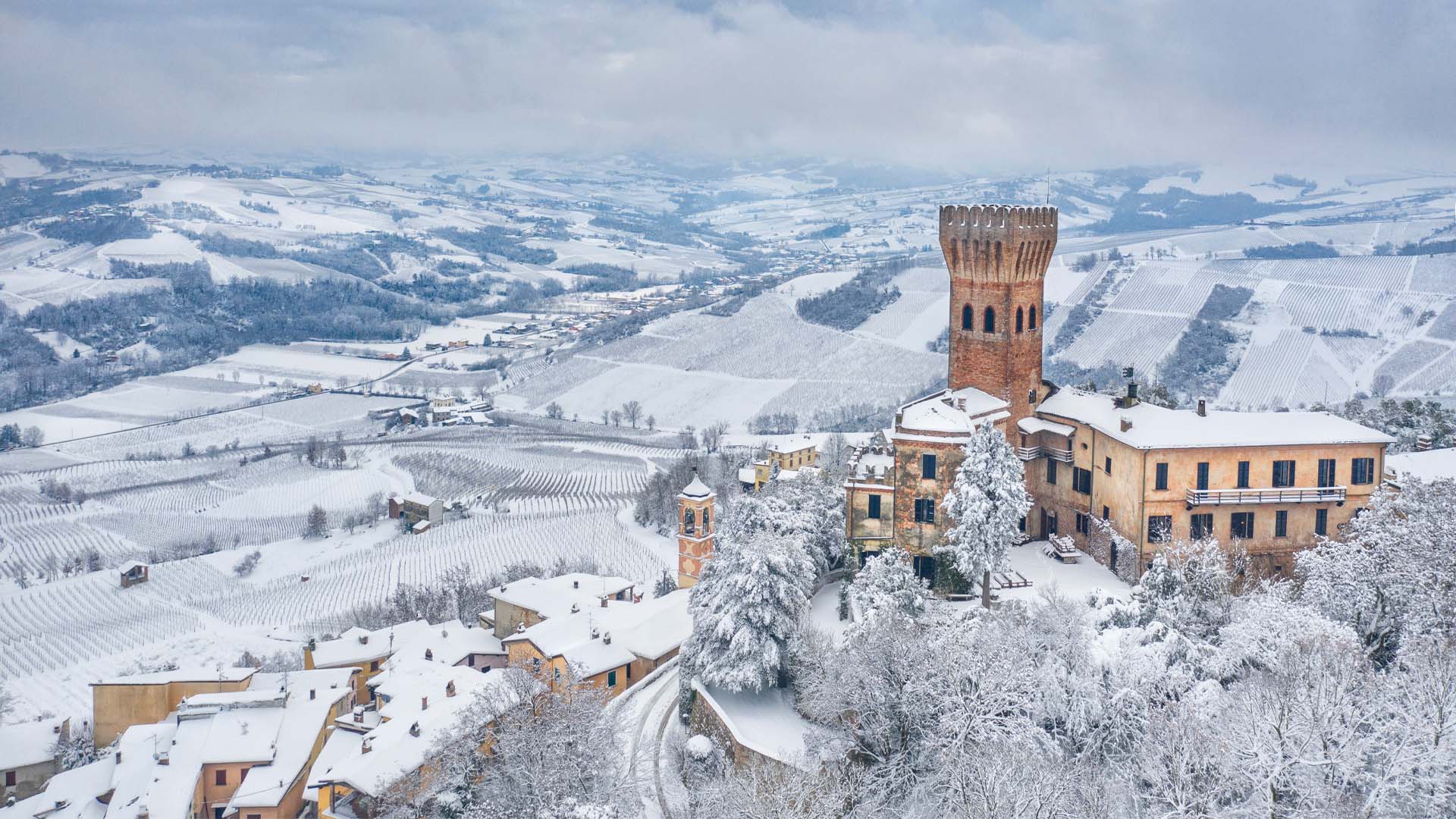 Un castello sulle bianche colline Il castello di Cigognola immerso nella neve, Pavia (© Massimo Ripani/Sime/eStock Photo)