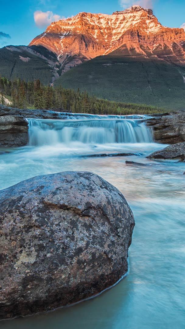 Alla scoperta dei Parchi delle Montagne Rocciose Canadesi Il tramonto illumina il Monte Fryatt mentre il Fiume Athabasca scorre sopra le omonime cascate nel Parco Nazionale Jasper, Alberta, Canada (© Robert Postma/Getty Images)