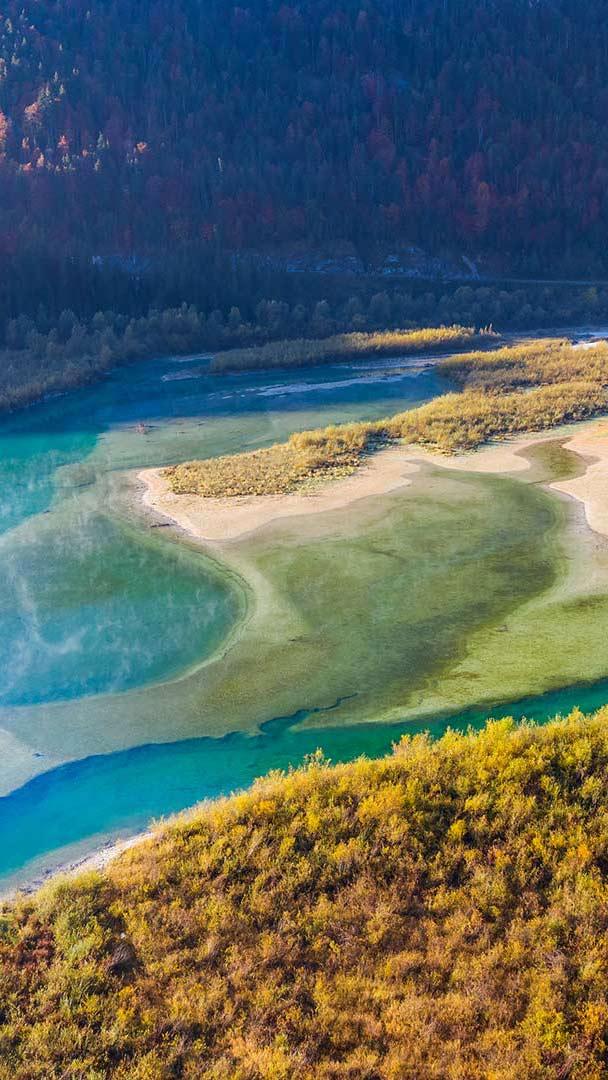 空から見たイーザル川 シルヴェンシュタインダムに注ぐイーザル川, ドイツ (© Martin Siepmann/Offset/Shutterstock)