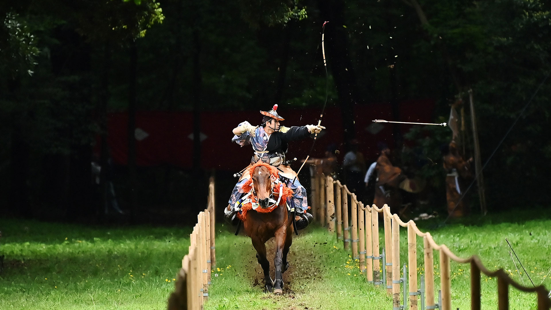 今日は「文化の日」 矢を放つ流鏑馬の射手, 東京 (© CHARLY TRIBALLEAU/Getty images)