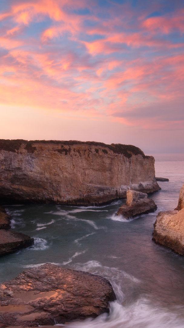 ここはシャーク・フィン・コーブ、米国カリフォルニア州のダベンポートにある海岸です。代表的な岩が、サメ(シャーク)のヒレの形に似ていることから名付けられました。夕方になると、海岸の岩はオレンジや赤みがかった色合いを呈し、まさに絵画のように美しいです…