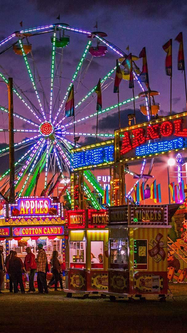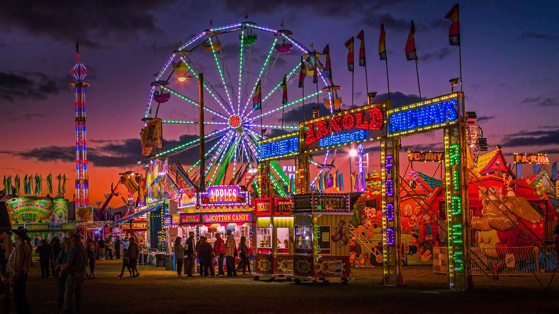 If it"s summer, there"s a fair going on somewhere. Looking at this photo, you can practically smell the cotton candy, hear the sonic blend of rides, carnival games, and music, and taste the sugary fried food (and feel your arteries clogging). Smaller fairs like this one in Hardee County, Florida, lead up to larger state fairs in most areas. August is the most popular month for state fairs, though a handful are in July, and some southern states have them during cooler months. Fairs weren"t always about rides and outrageously fattening foods, though. Beginning with the first state fair in Syracuse, New York, back in 1841, and long before anyone figured out how to fry a stick of butter, there were celebrations of agriculture and livestock, and those traditions continue. So, when you hit your local fair, don"t forget to check out the giant vegetables and costumed llamas before you get in line for the tilt-a-whirl or a deep-fried Snickers wrapped in bacon.