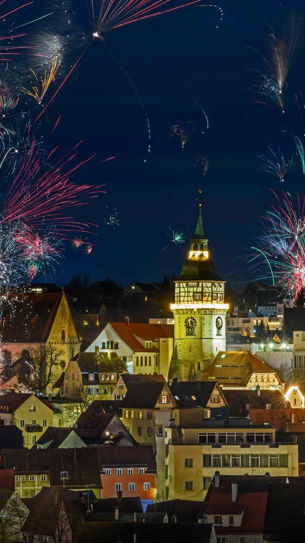 Backnang, the city celebrating the new year in this photo, is in Germany"s Baden region. Thanks to the Rhine River on the west, and the Black Forest to the east, the soil in Baden is ideal for vineyards. Among the varieties of wine produced here, Spätburgunder is popular, which you may know by its more common French name, Pinot noir. It seems likely that the people of Backnang would be celebrating with a glass of Pinot or something else this evening. However you choose to celebrate, here"s wishing you a very happy and healthy new year!