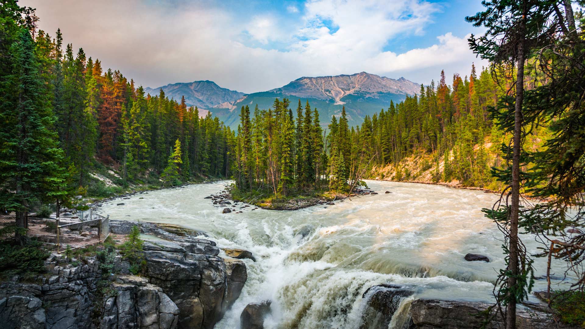 Sunwapta Falls is one of several spectacular waterfalls in Jasper National Park in Alberta, Canada. It"s actually a pair of waterfalls, a lower and an upper one, on the Sunwapta River. Their water comes from the Athabasca Glacier, so volumes are higher in the summer due to seasonal glacial melting. Jasper National Park is the largest national park in the Canadian Rockies, with more than 4,000 square miles for camping, hiking, water sports, and other activities. Wildlife in the park includes elk, grizzly bears, moose, bighorn sheep, and caribou.
