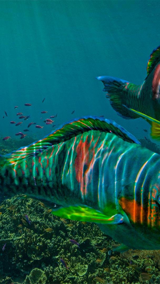 These brightly colored parrotfish are swimming off the coast of Negros Oriental province in the Philippines. There are dozens of species of parrotfish and they live in abundant numbers in the world"s tropical seas. These thick-bodied fish have large scales and a beak of fused teeth they use to diligently scrape delicious algae from reefs and rocks. Some also eat coral, which they grind up with plate-like teeth in their throats. Researchers say parrotfish play a critical role in the health of coral reefs by eating algae that can choke off coral growth. They also help replenish the white sandy beaches near these tropical reefs. How? After parrotfish digest the edible parts of coral, they excrete what"s left as sand—a lot of sand. In some species, a single parrotfish can poop almost 1,000 pounds of pearly white sand each year. But never mind that—some trivia is best not to dwell on.