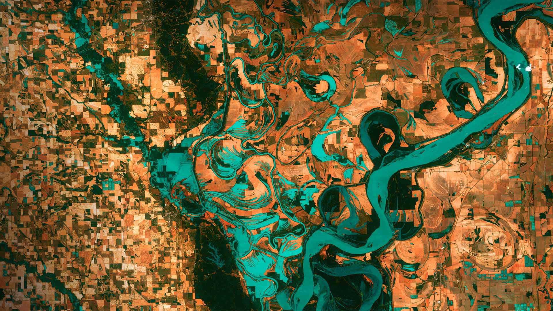 It"s Earth Day today and we are high above the blue marble looking down on the border between Arkansas and Mississippi. Those small, blocky shapes are towns, fields, and pastures, and the teal green is the mighty Mississippi River. Anyone who has flown in the window seat of an airplane and gazed down at Earth below might wonder why the colors in this image look so unreal. That"s because they are. This image was taken in 2013 by Landsat 7, a NASA satellite that uses thermal infrared sensors to help scientists better distinguish flora, fauna, water, and manmade objects. For almost 50 years, NASA has been using satellite imagery to understand how climate change and population growth are affecting our fragile planet. These satellites help NASA see where deforestation and wildfires are happening, where glaciers are melting, and how rising waters are encroaching on cities.