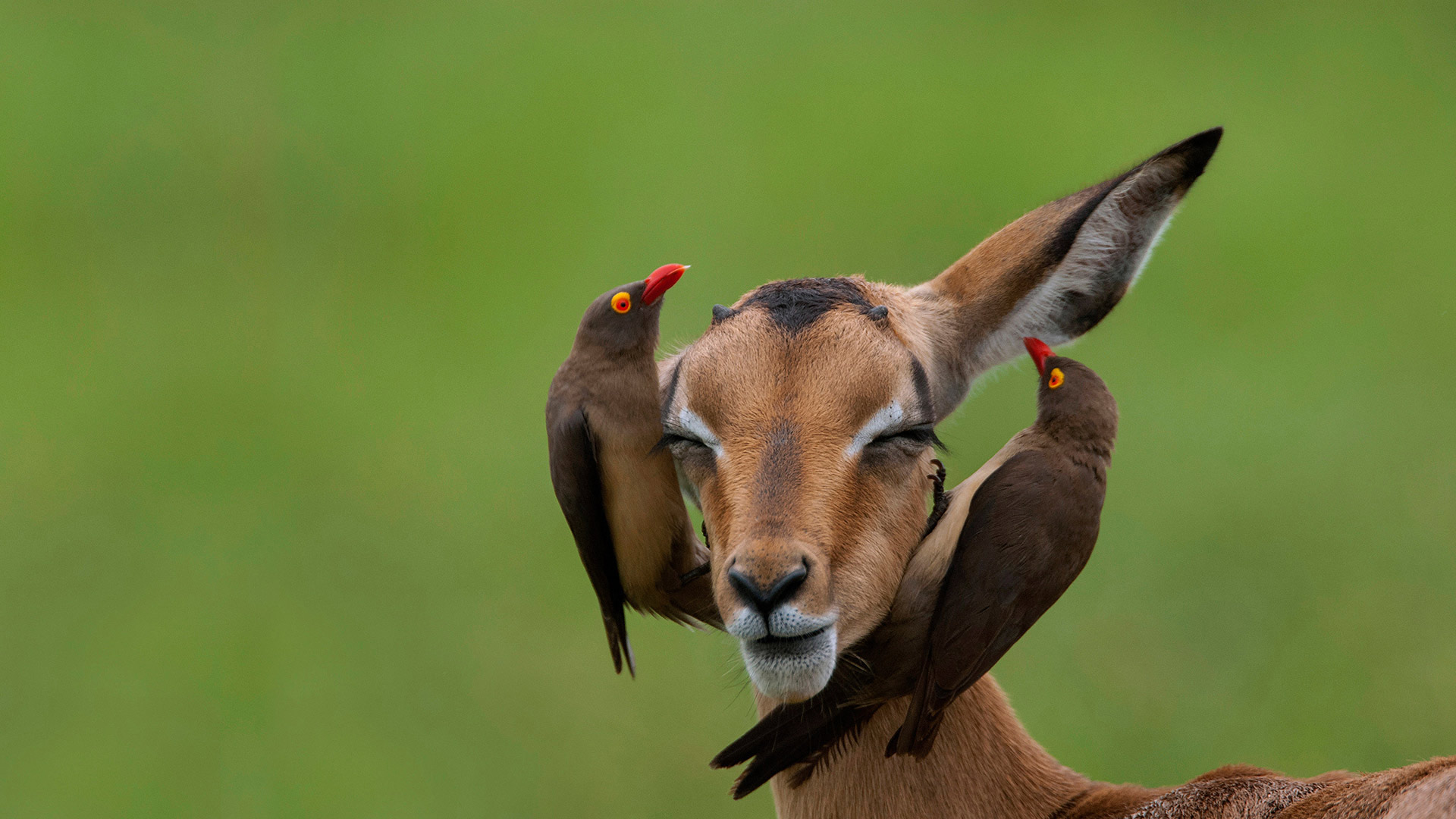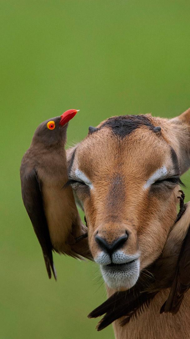 By posing for us, are these red-billed oxpeckers imposing on the impala? Well, science hasn"t quite decided on this one. The relationship between parasite-eating birds and hoofed mammals was once considered a textbook example of mutualism, with oxpeckers cleaning up the ticks and fleas that bug the bigger beasts. Which is what we"d like to think is going on here.