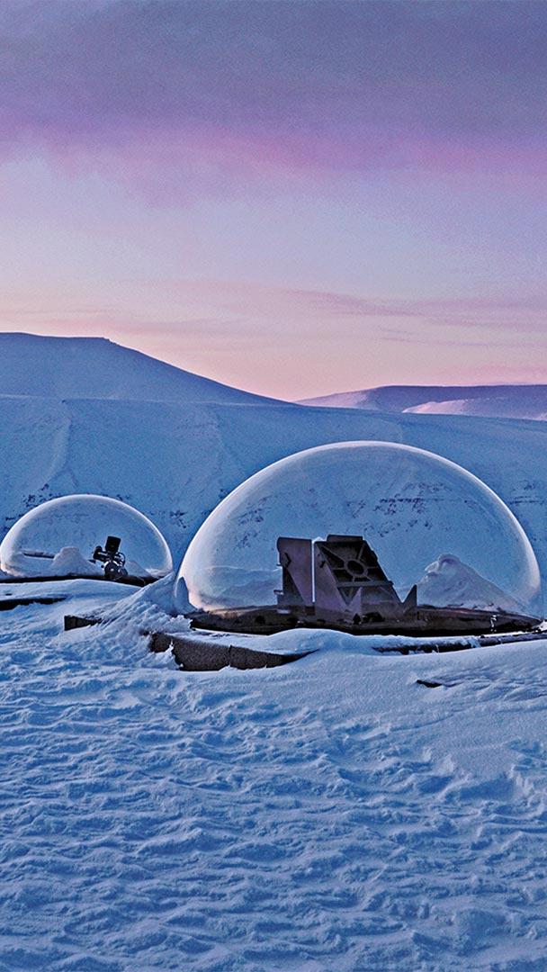 While these domes look like they should be in a movie set depicting a galaxy far, far away, they"re actually part of a scientific research station here on planet Earth. Kjell Henriksen Observatory is named for a Norwegian scientist whose research focused on the polar lights. The aurora borealis is frequently seen here, deep within the Arctic Circle in Norway"s remote Svalbard territory. And the observatory is specially designed to observe the aurora. Since it opened in 2008, the observatory has become a destination for atmospheric scientists, who can rent one of these 30 glass-topped rooms built to house high-end optical instruments.