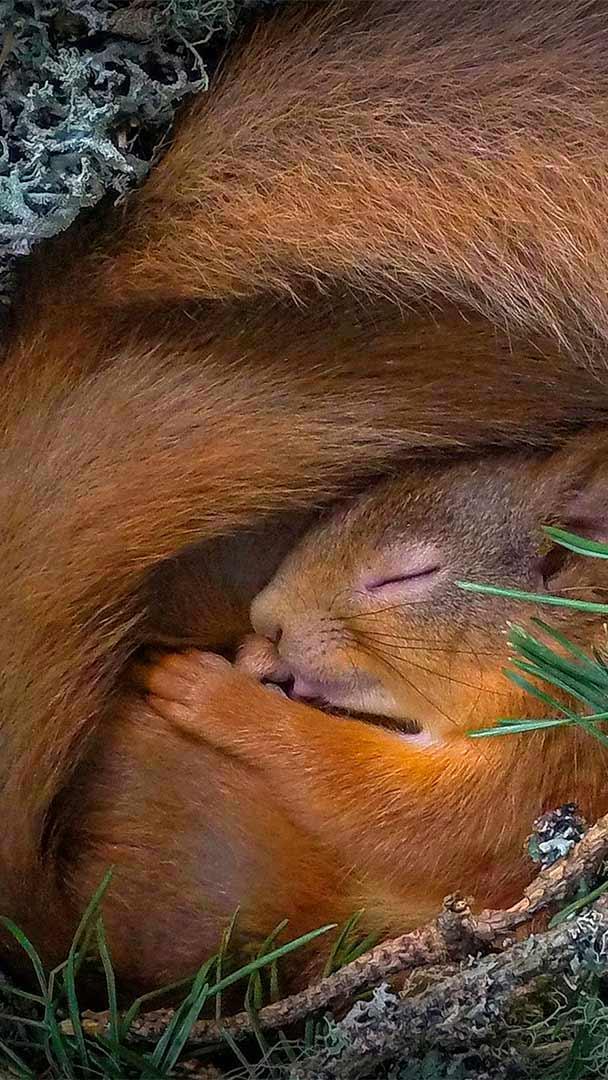 Shhh, it"s sleeping. But don"t confuse that with hibernating. A tree squirrel, like this red squirrel in Scotland, doesn"t hibernate during the winter. Hibernating is more of a ground squirrel trait. But the red squirrel is particular about where it sleeps, mostly building its nest, or drey, high above the ground in the cavity of an evergreen tree. Nests are often lined with soft materials such as leaves, moss, and grass. This little sleeper is using its bushy tail to keep warm, with the help of some lichen and pine needles.