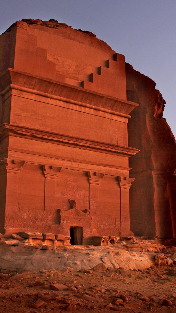 This is Qasr al Ferid, or ‘lonely castle,’ the largest of some 100 tombs here in the ancient Nabatean city of Hegra, now known as Mada’in Saleh. This site in Saudi Arabia is considered an archeological treasure for its well-preserved remains dating back nearly 2,000 years, when the Nabatean Kingdom flourished by trading incense, myrrh, and spices. While this particular tomb was never completed, its four-story size indicates it was intended for someone wealthy and powerful.