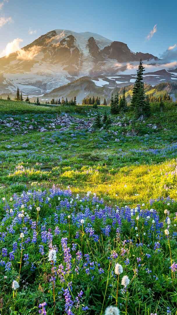 In the shadow of Mount Rainier, a carpet of wildflowers bursts into life. Every summer, the meadows around this mountain are colored with vivid shades of blooming subalpine flowers: purple asters, pink coralroot, and yellow tiger lilies, and more. Also known as Tahoma, at over 14,400 feet, Mount Rainier is the tallest mountain in the state of Washington. It is covered by 36 square miles of glaciers and permanent snowfields, the highest glacier ice cover of any mountain in the lower 48 states.