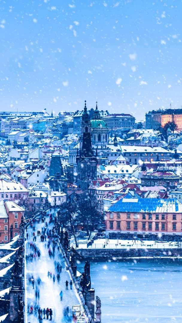 Hezké svátky (Happy holidays) from Prague! The Charles Bridge connects Old Town Prague to the rest of the capital of the Czech Republic. It’s a popular experience for tourists to walk the bridge, snapping photos of the many statues on the span. In our photo today, a light snow coats Prague and enhances the city’s old-world charm.