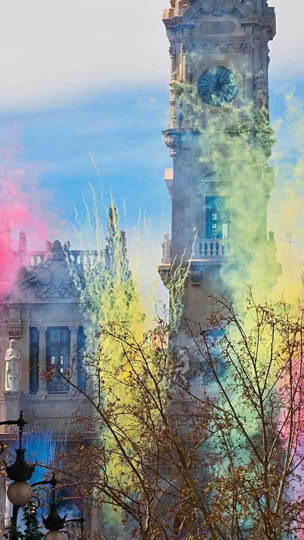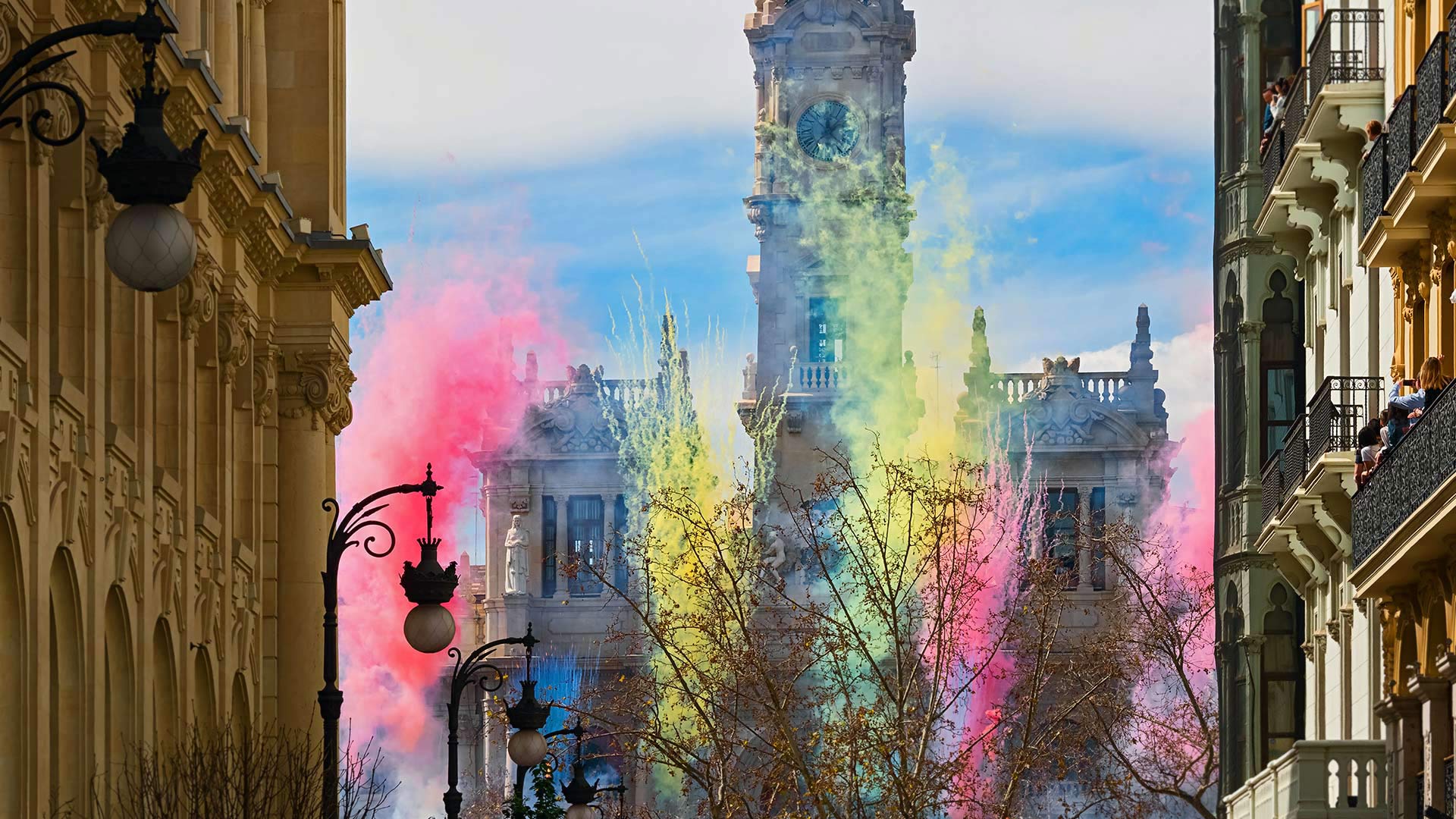 Today marks the fifth, final, fantastic day of this noisy, fire-and-smoke-filled holiday in Valencia, Spain. It"s called Las Fallas (or ‘Las Falles’ in the Valencian spelling), which means ‘torches’ in colloquial translation. While the origins of the festival aren’t entirely clear, the current customs borrow elements of pre-Christian spring festivals, Carnival, and the feast of St. Joseph—which is Father’s Day in this region. Each day of the festival follows a schedule of marching bands in the mornings and fireworks in the afternoon, which is what’s happening in our photo. There are dancers in traditional costumes as well, but the real spectacle comes tonight, as the parade of large, often bawdy wood and papier-mâché figures called ninots are marched through the streets and then added to a huge bonfire to welcome spring.