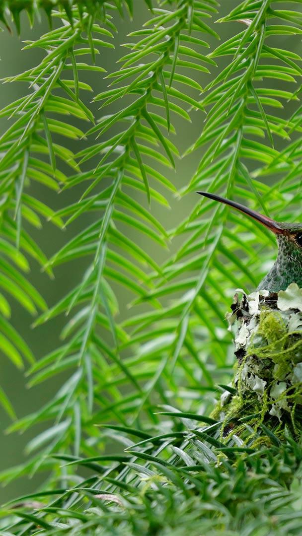 Say hello to the rufous-tailed hummingbird. This female is sitting in her tiny nest. Males look similar—lots of green, just like the females, but they have a bit more glitter on the throat and breast. Both sexes have a reddish-brown (rufous) forked tail—hence the name. Rufous-tailed hummingbirds are found in forests, gardens, and coffee plantations from southern Mexico down into South America, and they play an important role in pollination. Not to be confused with the smaller rufous hummingbird, which migrates through North America, the rufous-tailed is medium-sized and, like most hummingbirds, is very territorial when it comes to protecting its favorite feeding spots.