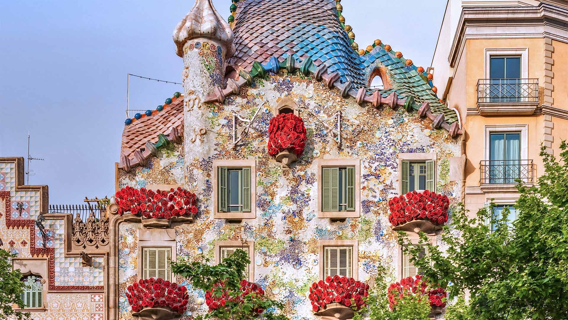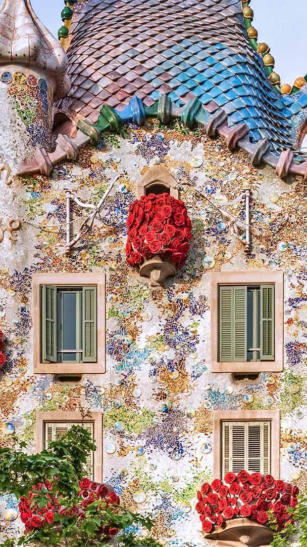 To celebrate Sant Jordi’s Day today, we’re studying the intricate façade of Casa Batlló in Barcelona, Spain. The holiday is the Catalan celebration of Saint George’s Day, which is observed throughout Europe. According to legend, Jordi (Catalan for ‘George’) saved a princess from the clutches of a terrible dragon. After rescuing her, the knight gave the damsel a red rose, which has become an important symbol of the holiday in Catalonia. As it happens, Spaniards also celebrate April 23 as Book Day, marking the anniversary of the death of Miguel de Cervantes, the famous 16th- and 17th-century Spanish writer. So here in Barcelona, both roses and books are given to loved ones on Sant Jordi’s Day, while music and dancing fill the streets. We might pause in our revelry to spend some time taking in Casa Batlló, designed by Spanish architect Antoni Gaudí. The building is heavily inspired by Sant Jordi’s legend, with red roses on the balconies, and a roof made to look like dragon scales.